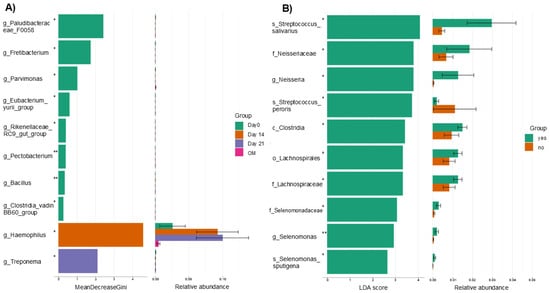 3.3. Differential Abundance on Days 0, 14 and 21 of CTX and in Patients Who Did or Did Not Develop Oral Mucositis