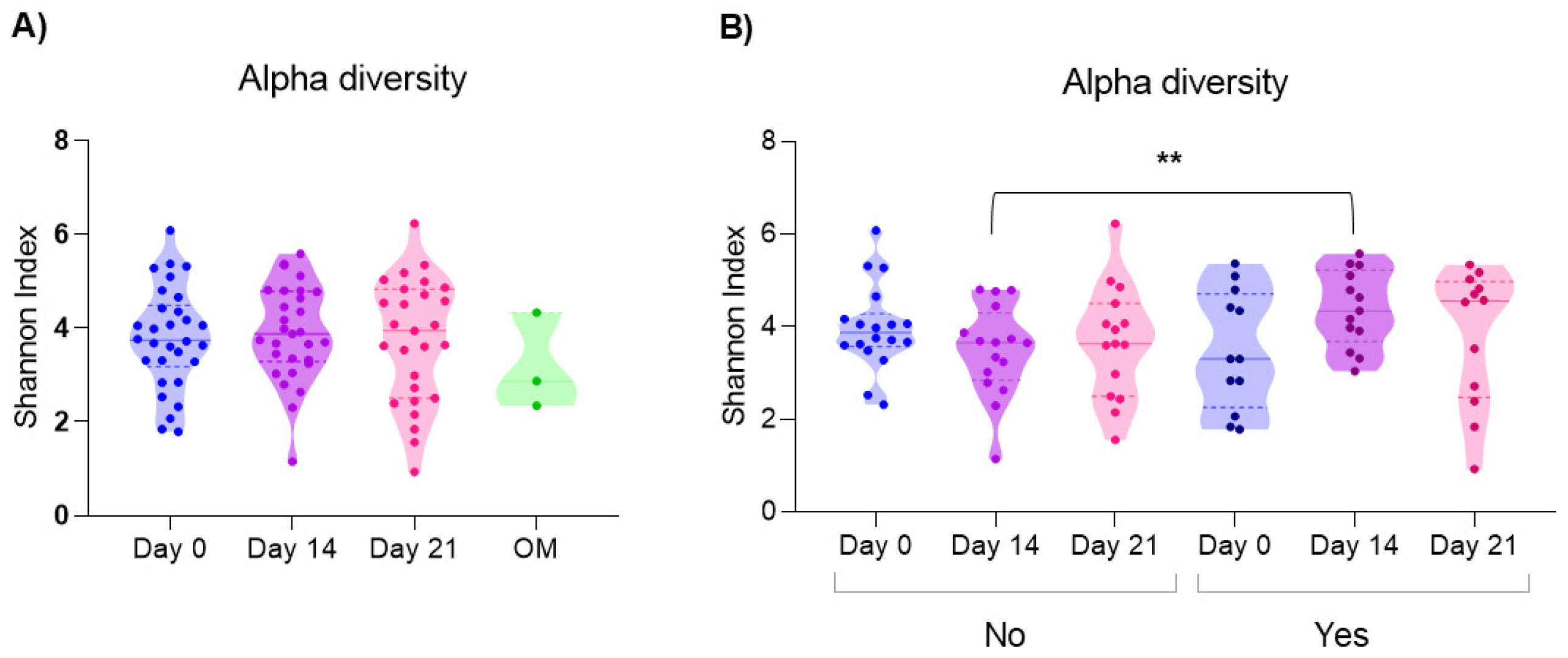 3.1. Alpha and Beta Diversity on Days 0, 14 and 21 of CTX and in Patients Who Did or Did Not Develop Oral Mucositis