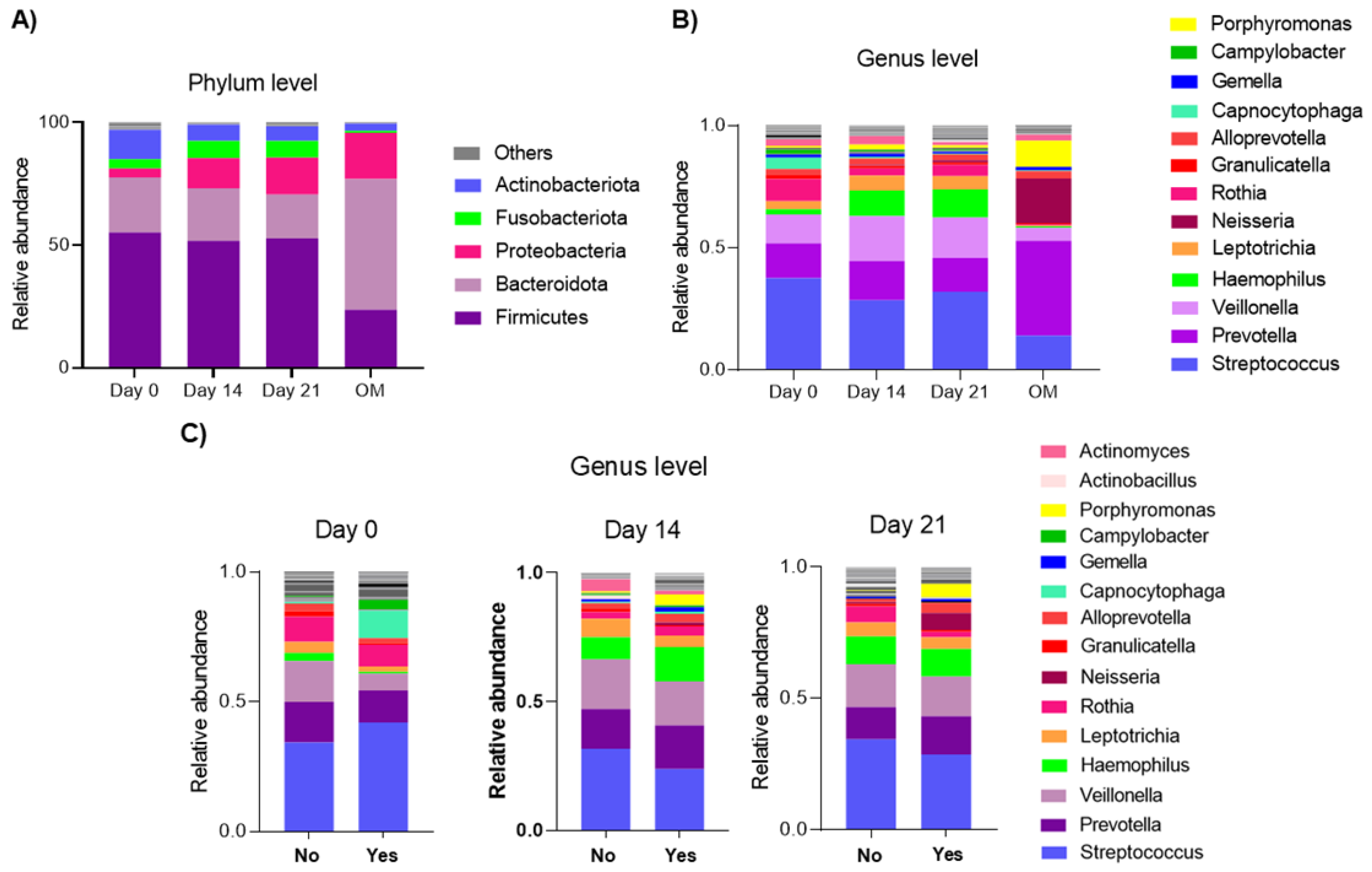3.2. Relative Abundance on Days 0, 14 and 21 of CTX and in Patients Who Did or Did Not Develop Oral Mucositis