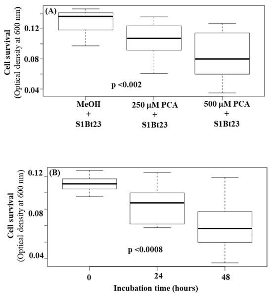 Boxplot visualization of the effect of phenazine-1-carboxylic acid concentration (A) and time of incubation (B) on the survival of Pseudomonas chlororaphis subsp. phenazini S1Bt23 cells incubated with methanol (MeOH; negative control). Blanked OD600 measurements were used. Statistical significance was calculated using two-way ANOVA followed by Tukey’s post hoc test. The probability values in each box denote significant differences between the three means.