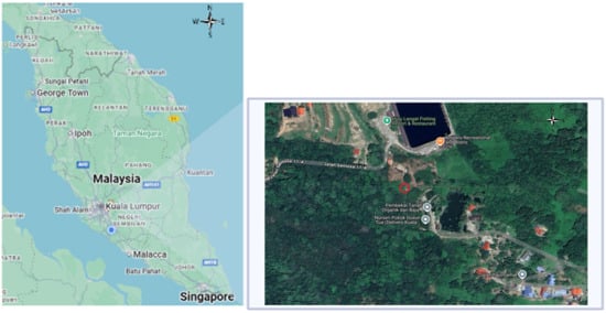 Sampling site of the study area in Kampung Batu 16, Dusun Tua, Hulu Langat, Selangor (see red circle). The coordinate of the sampling site is 3°8.6566′ N, 101°50.0792′ E.