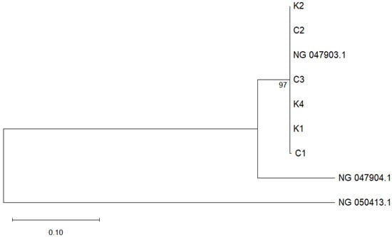 Given the absence of fusB and fusC among the isolates, subsequent phylogenetic analysis focused on the fusF gene sequences was performed. Maximum likelihood phylogenetic analysis revealed a clear and well-supported clustering pattern among the environmental isolates and reference strains (Figure 3). All environmental isolates from this study (K1, K2, K4, C1, C2, and C3) grouped with NG_047903.1, with strong bootstrap support of 97%. The reference sequence NG_047904.1 branched as a sister lineage outside the main cluster. Notably, NG_050413.1, representing the fusC sequence from S. aureus, branched distantly from the fusF cluster, thereby confirming its role as an outgroup.