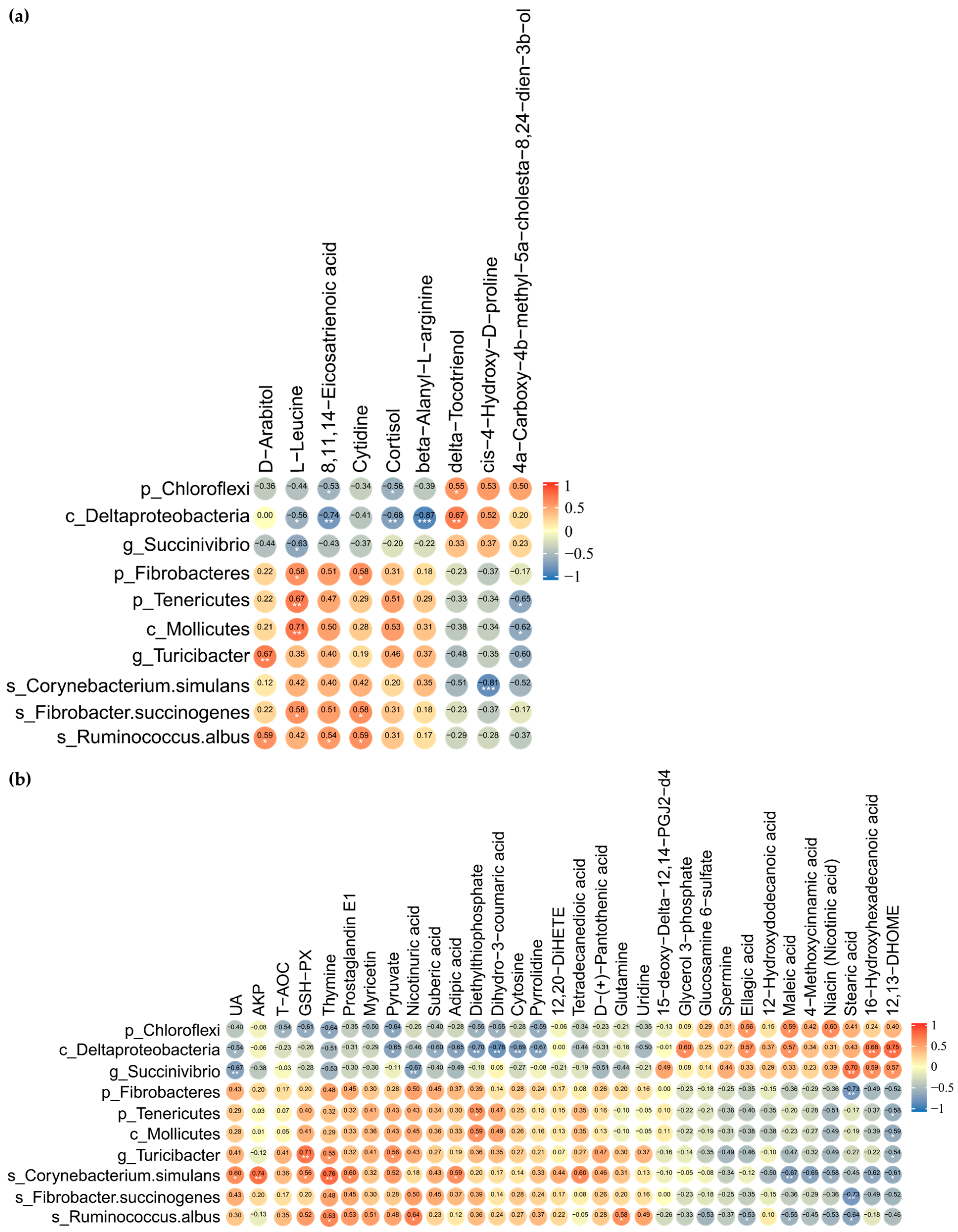 3.7. Spearman Correlation Analysis Between Differential Fecal Microbiota and Metabolites in Feces