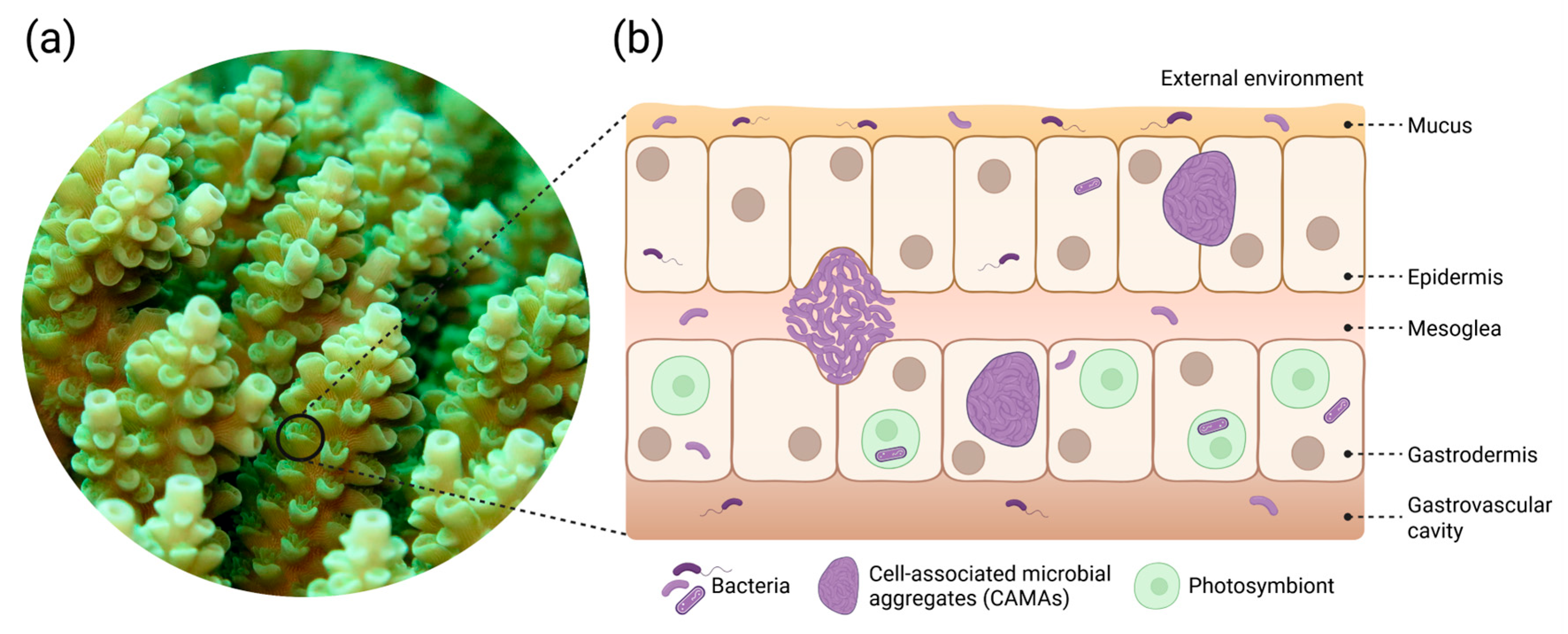 - Thompson, J.R.; Rivera, H.E.; Closek, C.J.; Medina, M. Microbes in the coral holobiont: Partners through evolution, development, and ecological interactions. Front. Cell. Infect. Microbiol. 2015, 4, 176. [Google Scholar] [CrossRef]