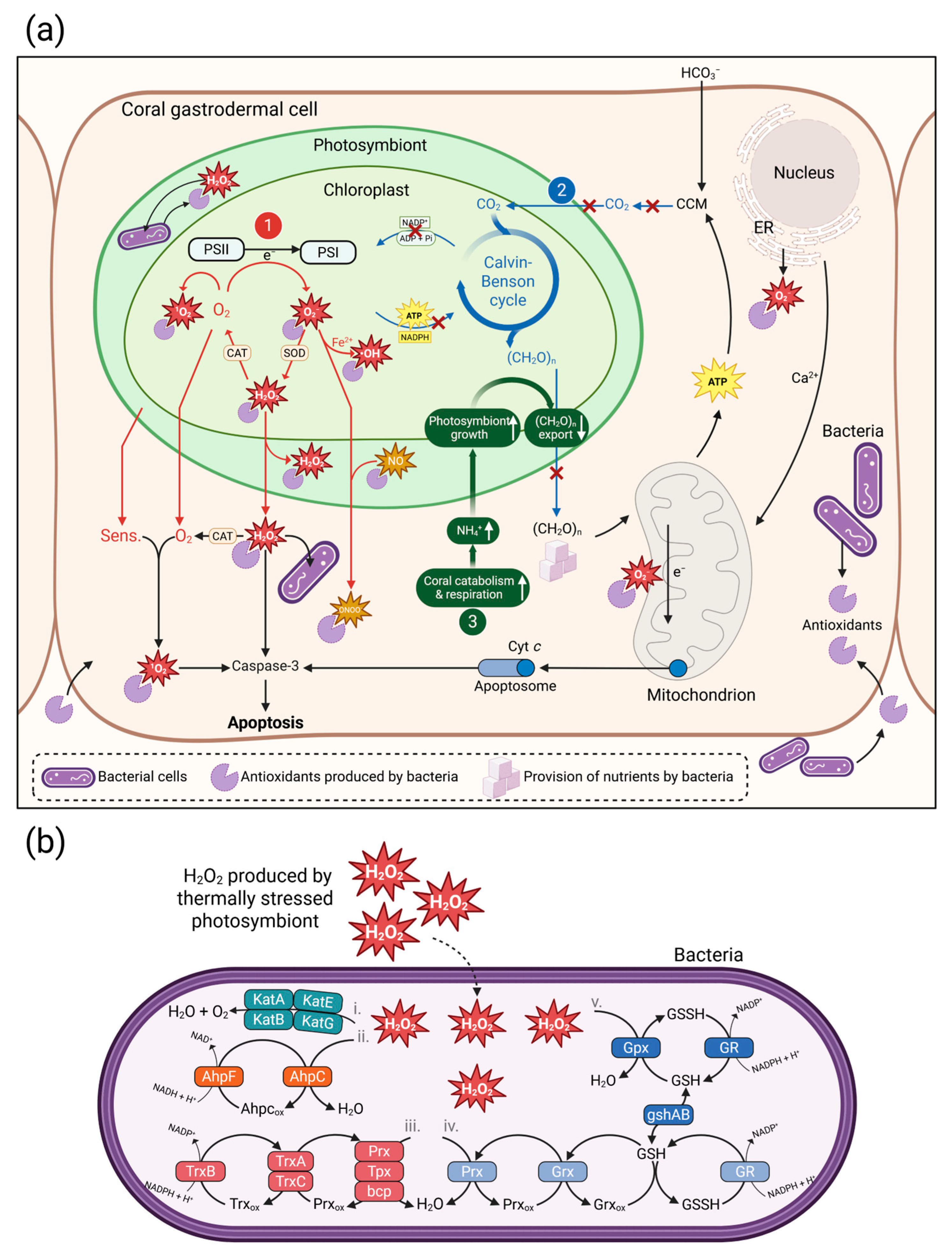- Rädecker, N.; Pogoreutz, C.; Gegner, H.M.; Cárdenas, A.; Roth, F.; Bougoure, J.; Guagliardo, P.; Wild, C.; Pernice, M.; Raina, J.-B.; et al. Heat stress destabilizes symbiotic nutrient cycling in corals. Proc. Natl. Acad. Sci. USA 2021, 118, e2022653118. [Google Scholar] [CrossRef] [PubMed]