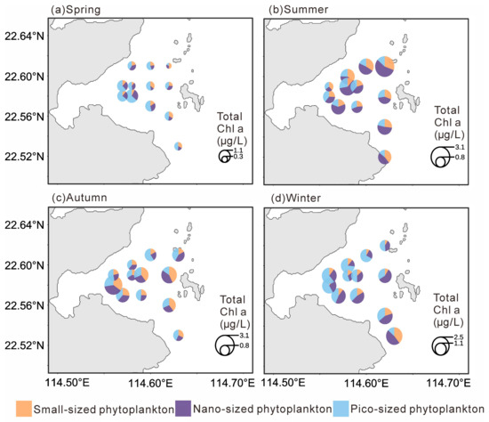 Distribution of the size-fractionated chlorophyll a concentration in four seasons.