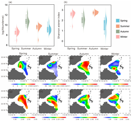 Abundance (a) and Shannon–Wiener index (b) values in four seasons. Spatial distribution of abundance (c–f) and Shannon–Wiener index (g–j) in four seasons (dots in the map indicate sampling stations).