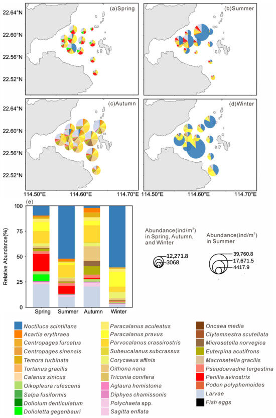 Spatial distribution of each mesoplankton species (a–d) and relative abundance of each species in all species (e) in four seasons.