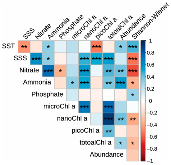 Correlation analysis showed that the total mesozooplankton abundance was significantly negatively correlated with SST (p < 0.05), Nitrate (p < 0.01), Ammonia (p < 0.001), nanoChl a (p < 0.01), and totalChl a (p < 0.05; Figure 7). The Shannon–Wiener index was significantly negatively correlated with SST (p < 0.001) and Phosphate (p < 0.05) but positively correlated with SSS (p < 0.001), Nitrate (p < 0.001), Ammonia (p < 0.05), nanoChl a (p < 0.01), and totalChl a (p < 0.05; Figure 7).