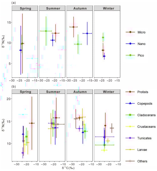 Bi-plots of stable carbon and nitrogen isotope ratios of size-fractionated phytoplankton (a) and major mesozooplankton groups (b) in the thermal discharge area of Daya Bay Nuclear Power Station in four seasons. Micro, small-sized plankton (20~200 μm); Nano, nano-sized plankton (2~20 μm); Pico, pico-sized plankton (0~2 μm).