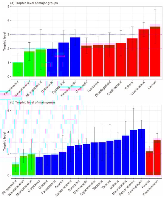 The trophic levels of major planktonic groups (a) and major planktonic genus (b). Dashed lines of trophic levels at 2 and 3 indicate herbivory and carnivory, respectively. Green bars indicate size-fractionated phytoplankton, blue bars indicate copepods, while red bars indicate cladocerans.