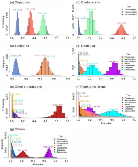 Food composition of main mesozooplankton groups: Copepods (a); Cladocerans (b); Tunicates (c); Noctiluca scintillans (d); Other crustaceans (e); Planktonic larvae (f); Other mesozooplankton (g).
