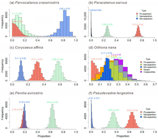 Food composition of main mesozooplankton species: Parvocalanus crassirostris (a); Paracalanus parvus (b); Corycaeus affnis (c); Oithona nana (d); Penilia avirostris (e); Pseudevadne tergestina (f).