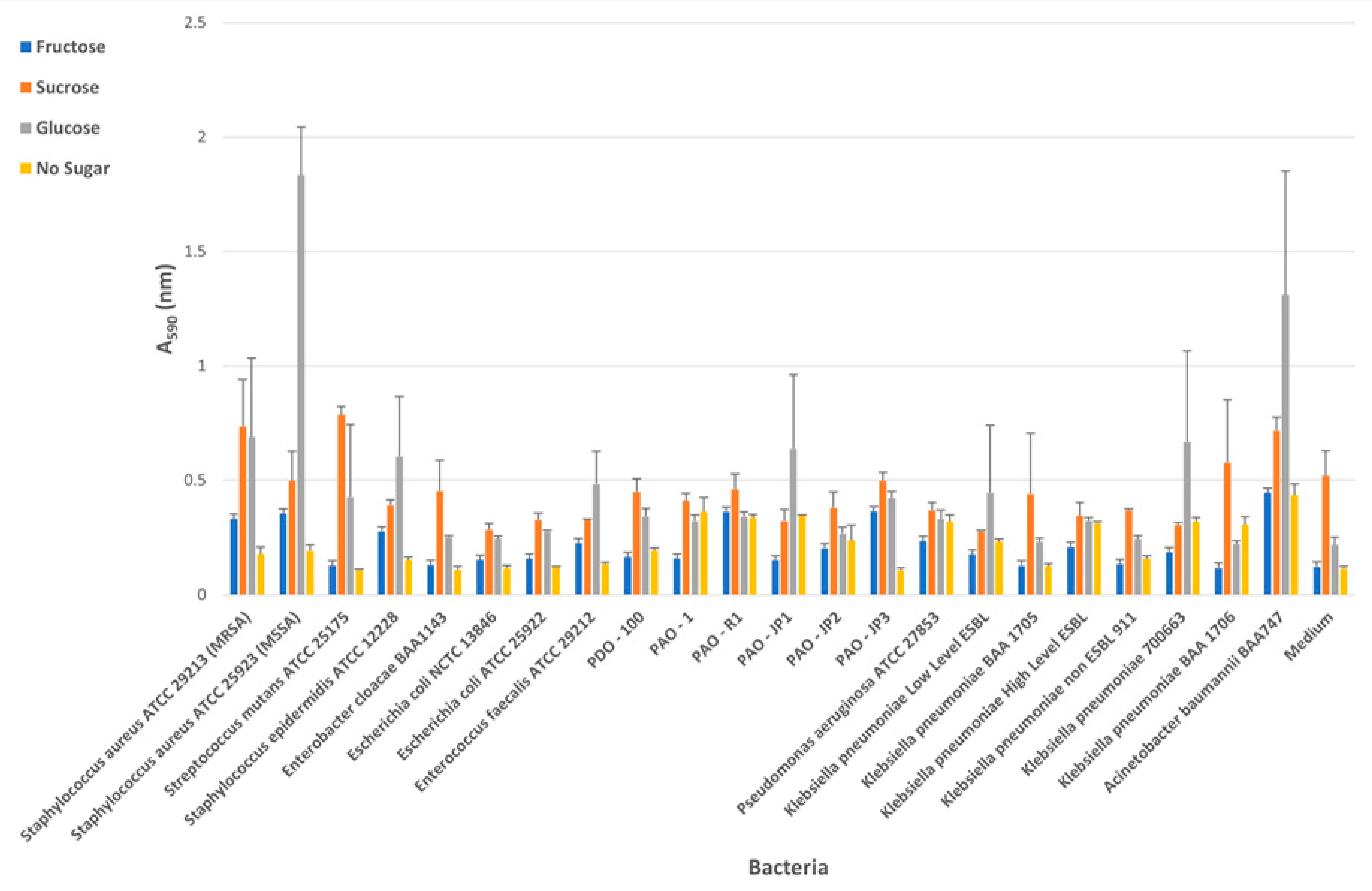 | Bacteria | CV Glucose | CR Glucose | CV Fructose | CR Fructose | CV Sucrose | CR Sucrose | CV No Sugar | CR No Sugar |