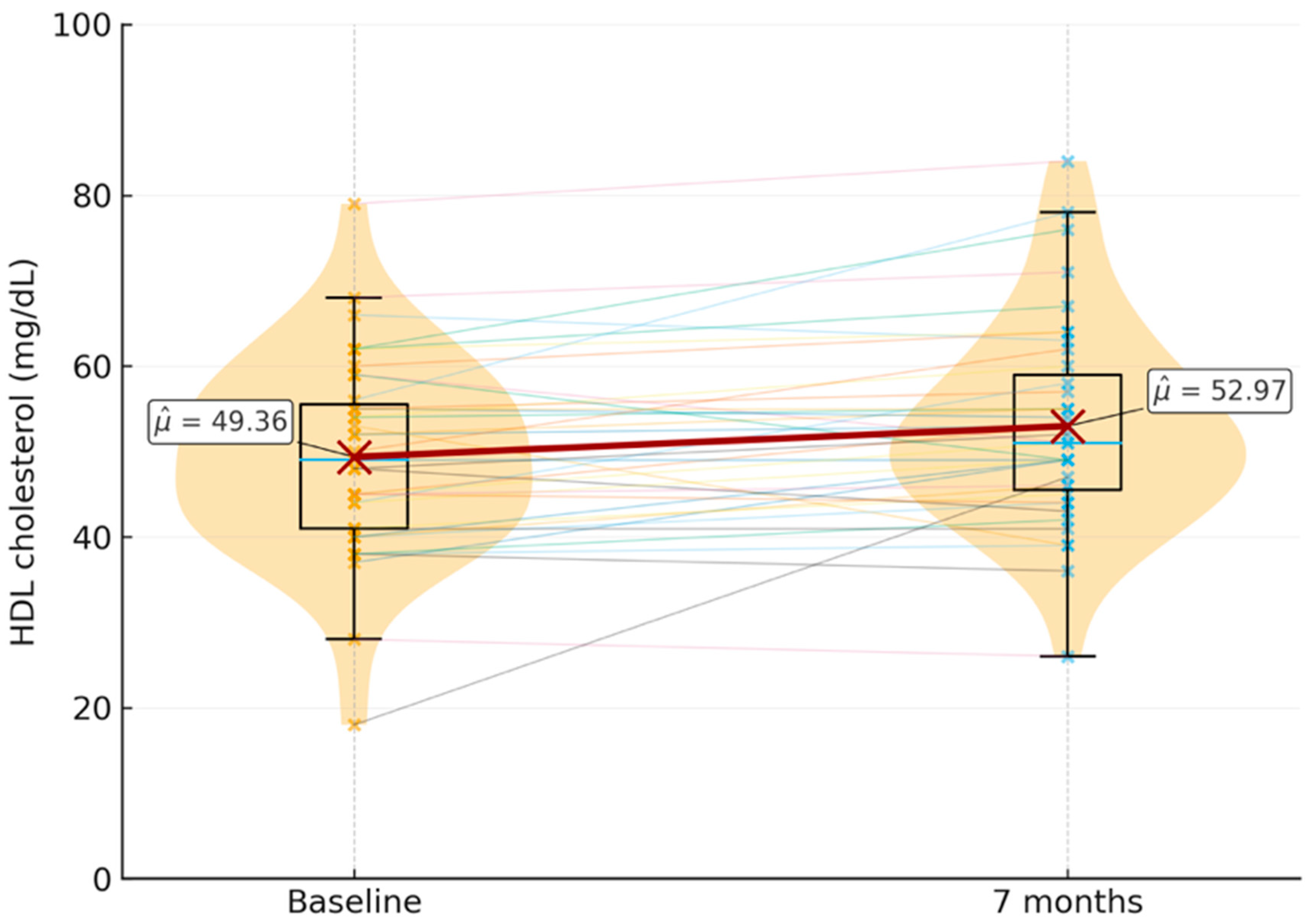 Distribution of HDL cholesterol levels (mg/dL) at the baseline and seven months after switching to long-acting injectable cabotegravir plus rilpivirine (n = 39). Violin plots with overlaid boxplots show the individual distributions; dashed lines connect paired values for each participant. Mean HDL levels increased from 49.4 mg/dL (SD = 11.5) at the baseline to 53.0 mg/dL (SD = 11.9) at seven months, representing a statistically significant increase (p = 0.0065).