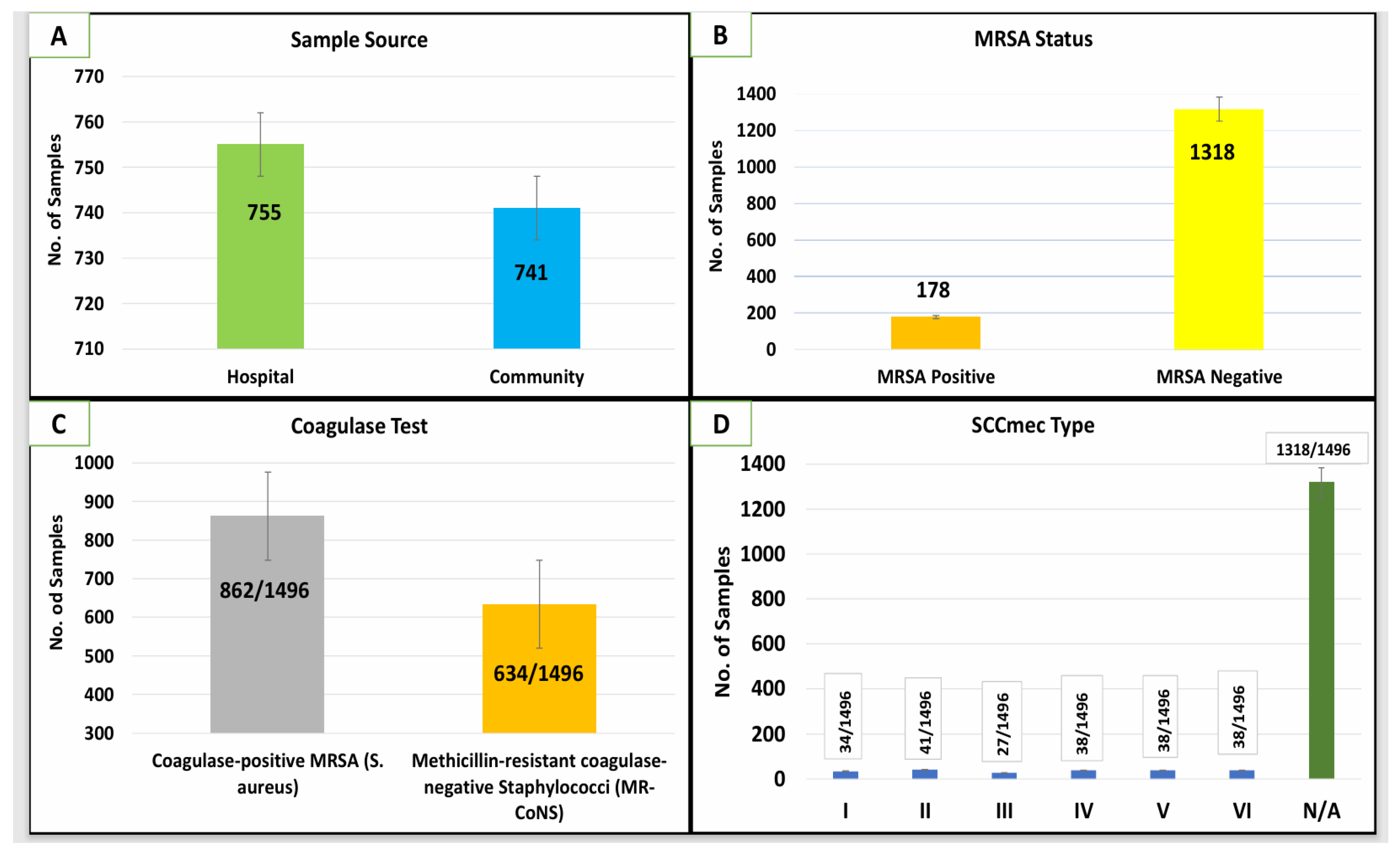 APA StyleMoursi, S. A., Saleem, M., Syed Khaja, A. S., Rakha, E., Alshurtan, K. S., Fahmy, N. F., Alshammari, A. D., Abdallah Abboh, E. A., Alshammari, M. N., & Almalaq, H. (2026). Prevalence, Antimicrobial Resistance, and Molecular Characteristics of MRSA in Saudi Arabia: A Retrospective Study. Microorganisms, 14(1), 227. https://doi.org/10.3390/microorganisms14010227