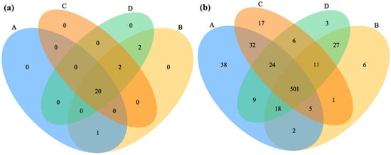 Venn diagrams comparing the taxonomic composition shared between different sample groups at the (a) phylum and (b) genus levels. Sample sizes per group were as follows: A (n = 6), B (n = 2), C (n = 3), and D (n = 3).
