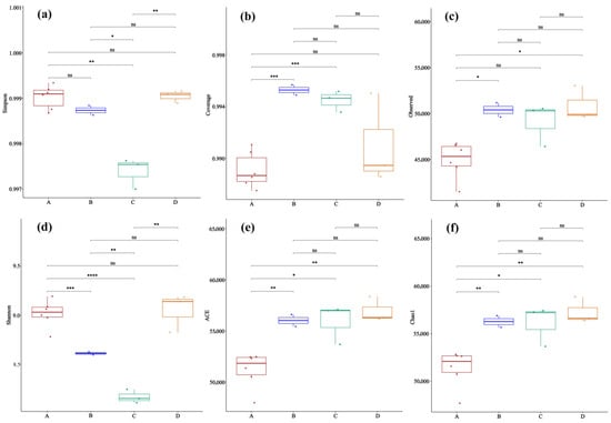Comparison of the microbial α-diversity between rodent lung sample groups to assess the effects of treatment on the community richness and evenness (ANOVA). (a) Simpson index; (b) Coverage; (c) Observed species number; (d) Shannon index; (e) ACE; (f) Chao1 index. Sample sizes per group were as follows: A (n = 6), B (n = 2), C (n = 3), and D (n = 3). Significance levels: ns, p > 0.05; *, p < 0.05; **, p < 0.01; ***, p < 0.001; ****, p < 0.0001.