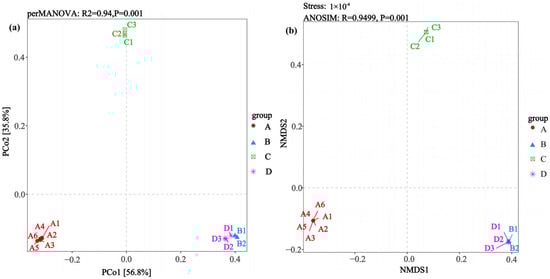 Comparative analysis of β-diversity patterns (via PCoA and NMDS) addressing differences in lung microbiota between Hantavirus-infected and Hantavirus-uninfected rodent groups. (a) PCoA; (b) NMDS. Sample sizes per group were as follows: A (n = 6), B (n = 2), C (n = 3), and D (n = 3).