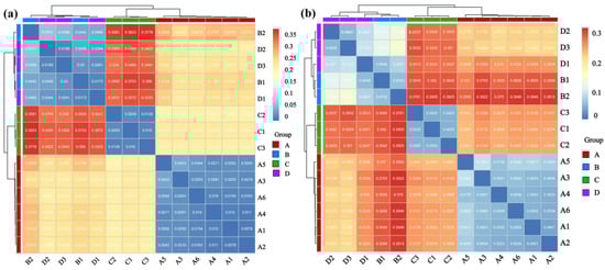 In contrast, comparisons between the groups showed a significant differentiation pattern. The correlation values between Groups A and C (same rodent species with different infection statuses) were mostly distributed in the low range of 0.2–0.4 with distinct color contrast in the heatmap, and the inter-group correlations between Groups A and B/D (different rodent species with different viral infections), as well as between Groups C and B/D (different rodent species with different infection statuses), also remained at low levels (0.3–0.5). The cluster tree further confirmed this trend of inter-group separation with Groups A and C each forming independent clades, and Groups B and D clustering into the same major clade but remaining distinguishable. This pattern is consistent with associations between the rodent species, Hantavirus infection status, and differences in microbial community structure.