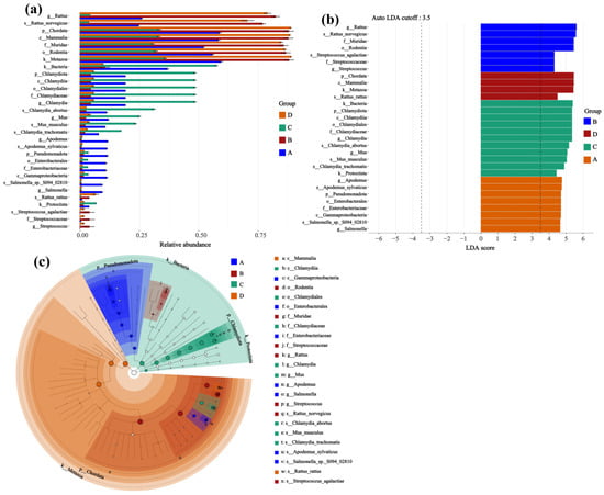 Screening for differentially abundant taxa based on microbial community composition and linear discriminant analysis effect size. (a) Relative abundance; (b) LDA score; (c) Cladogram. Sample sizes per group were as follows: A (n = 6), B (n = 2), C (n = 3), and D (n = 3).