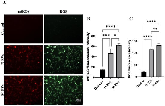 Excessive generation of ROS is a key driver of oxidative stress and dysfunction in endothelial cells [21]. To determine whether N-EVs and M-EVs could promote the burst generation of ROS in HUVECs, we intervened HUVECs with N-EVs and M-EVs at a concentration of 20 μg/mL for 24 h. We used specific fluorescent probe staining to detect the levels of mtROS and total cellular ROS generation. The results showed that both N-EVs and M-EVs significantly promoted the generation of mtROS and total cellular ROS, and the level of mtROS and total cellular ROS generation under the treatment of M-EVs was significantly higher than that of the effect of N-EVs (Figure 3A–C), suggesting that P. gingivalis EVs have the role of inducing oxidative stress in HUVECs and that P. gingivalis EVs produced by P. gingivalis in metronidazole incubation can enhance the oxidative stress response of HUVECs.