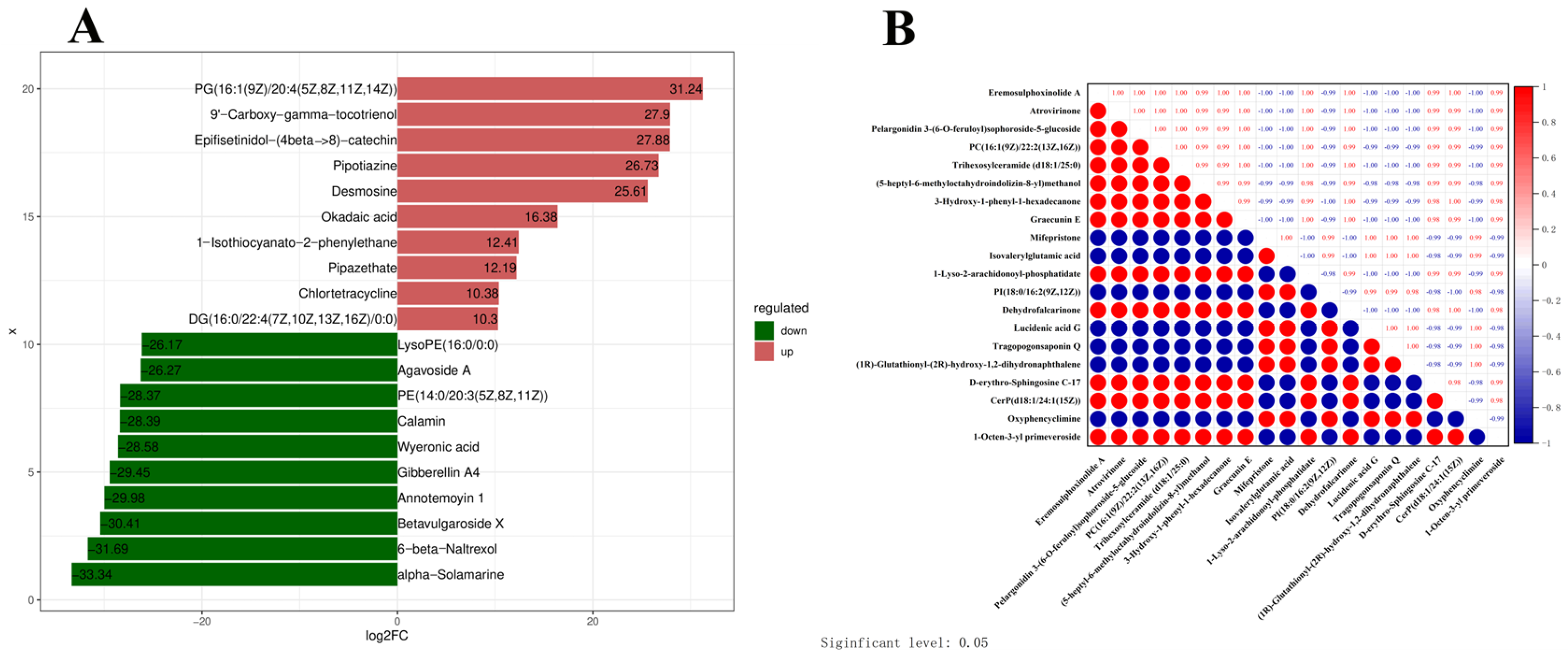 | Tragopogonsaponin Q | −0.470967794 | 2.80 × 10−5 | 2.16494858 | down |