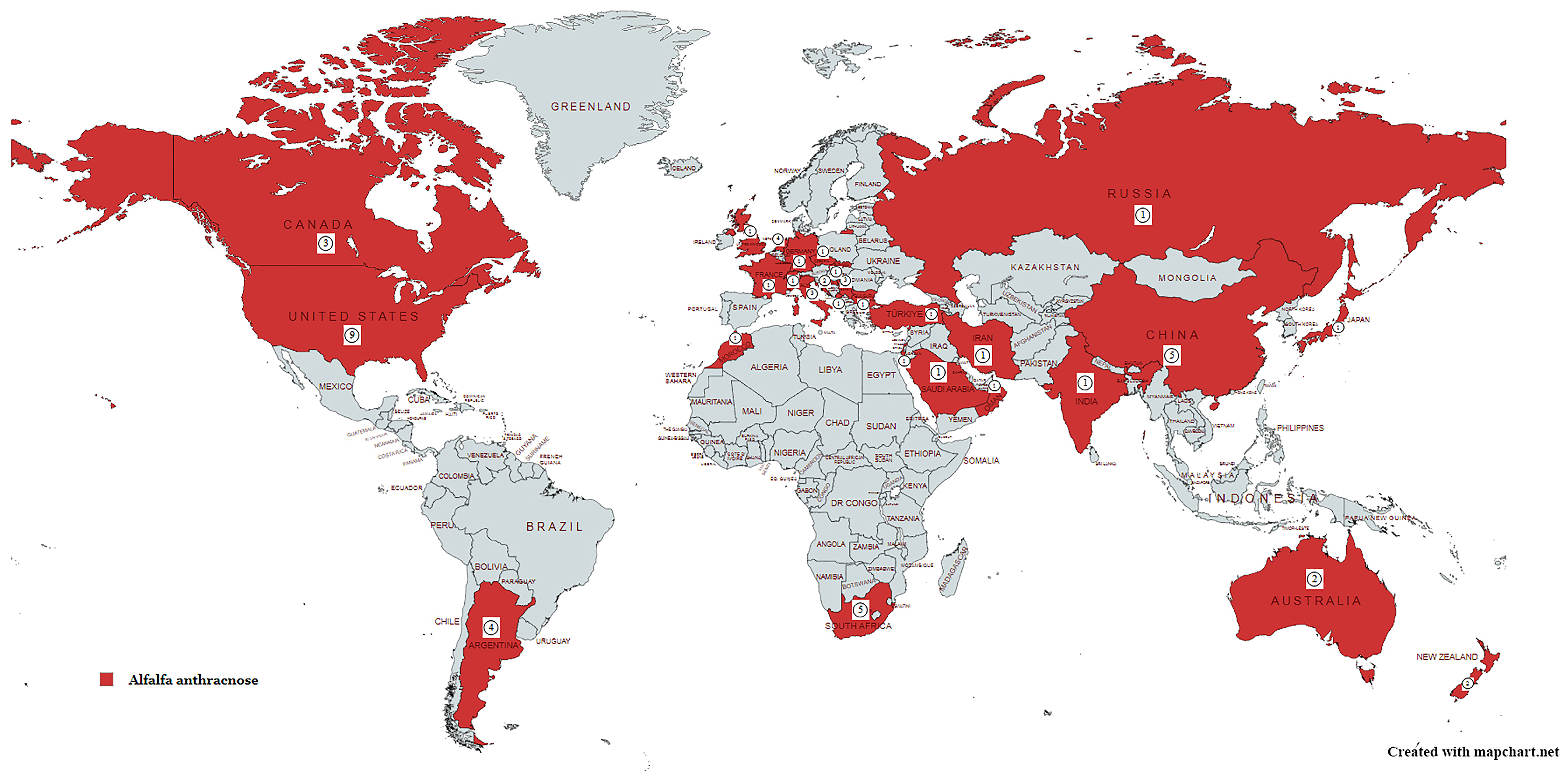 - Colletotrichum truncatum (Schwein.) Andrus & W.D. Moore was first described as Vermicularia truncata by Schweinitz [121] in pods of Phaseolus in Pennsylvania, USA. It was later renamed C. truncatum [122]. It belongs to the C. truncatum species complex [55]. To date, C. truncatum has been confirmed on alfalfa in the USA [60,65,67], South Africa [81], Argentina [65], Australia [65,123], Turkey [22], the Netherlands [48], Israel [49], and China [11].