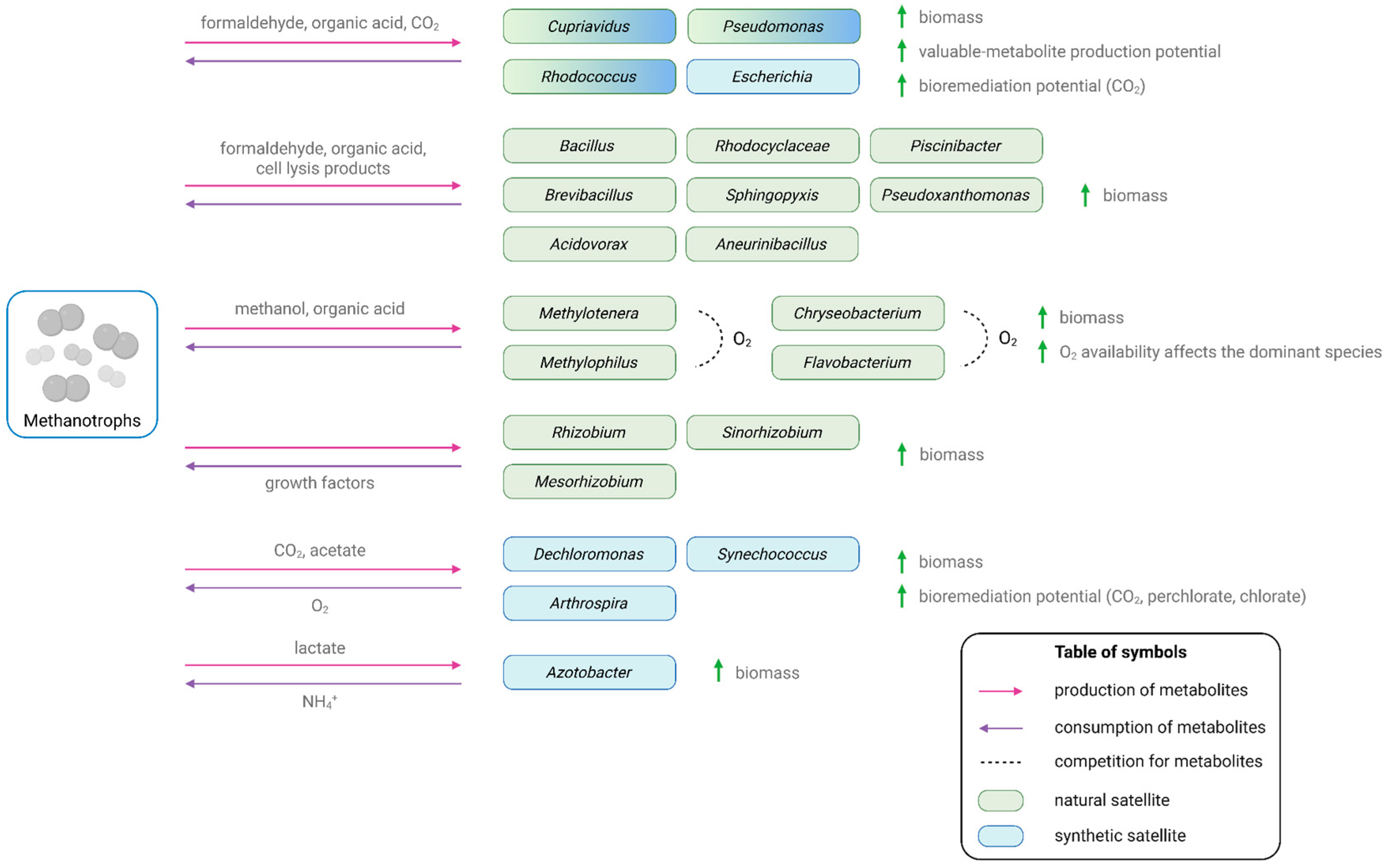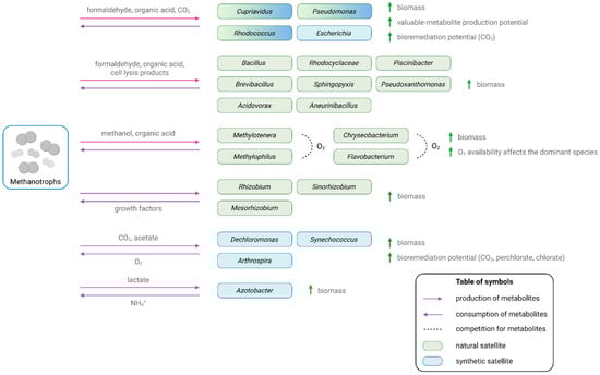 Thus, even taking into account the advantages of mixed methanotrophic cultures, their use at the current stage resembles interaction with a “black box”. To unlock their full potential, it is necessary to move beyond descriptive studies toward predictive frameworks. Systems biology offers the necessary tools to decipher complex interspecies interactions. However, a systematic link between satellite taxonomy, metabolic roles, and available modeling resources is currently missing. This review compiles satellite organisms reported in both natural and synthetic methanotroph-associated communities and categorizes them according to their effects on community function and their potential relevance to bioremediation and biotechnology. The taxonomy-function overview is linked to systems-biology approaches that can provide a mechanistic understanding of key features of such consortia. We also evaluate the current landscape of genome-scale metabolic (GSM) modeling for methanotroph-associated organisms. A critical shortage of strain-specific GSMs for satellite species and community-level GSM reconstructions for methanotroph–heterotroph consortia are highlighted, as these limitations complicate the rational design of synthetic methanotrophic communities.