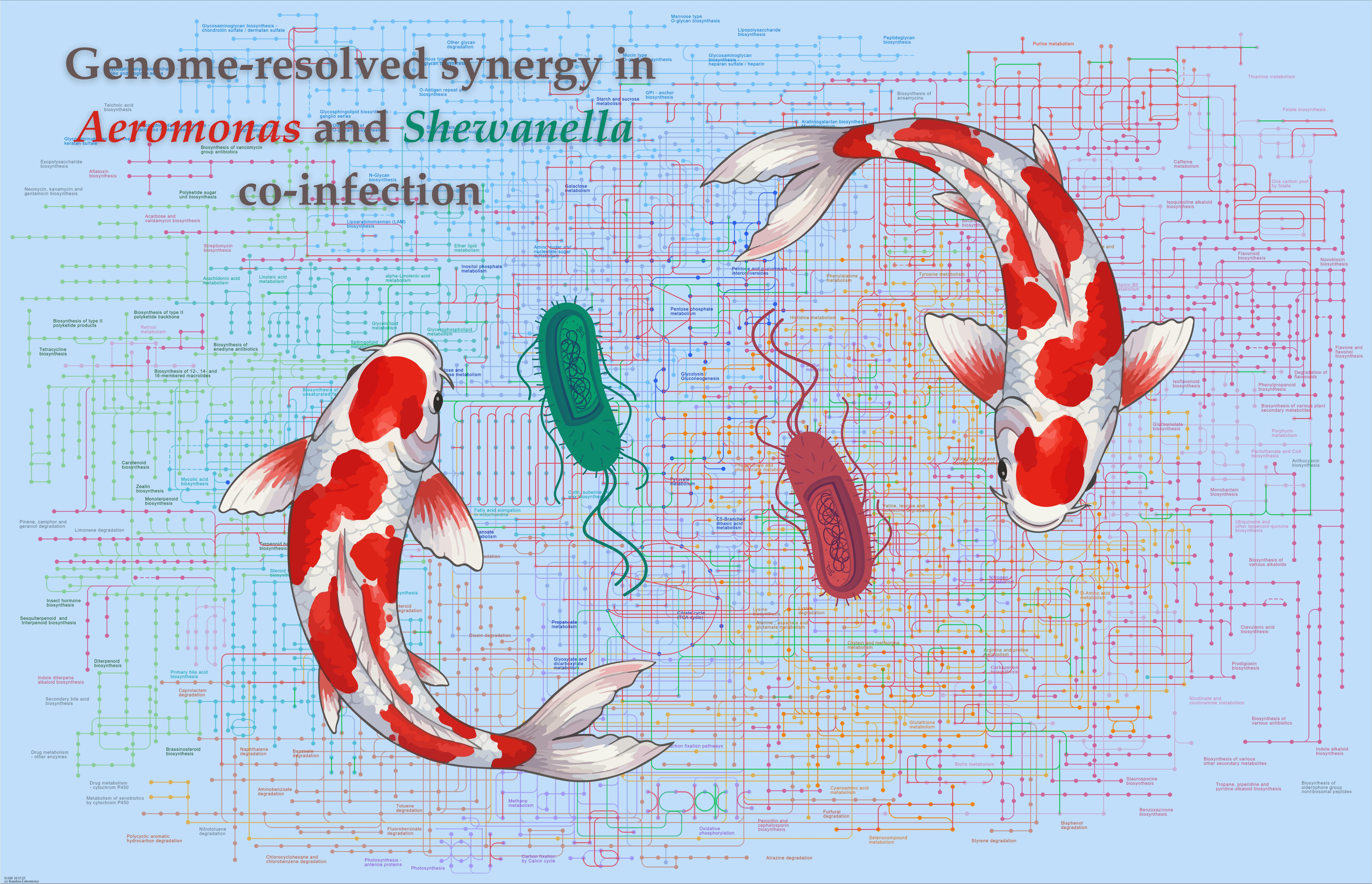 We co-isolated Shewanella sp. and A. veronii from a moribund koi, confirmed identity (culture/biochemistry/MALDI-TOF), and generated draft genomes. Using OrthoVenn3, KEGG (BlastKOALA/Mapper), antiSMASH, and resistome/virulence screens, we performed comparative functional genomics. The integrated in silico analysis delineated complementary and interaction-related pathways (e.g., siderophores, secretion/biofilm, quorum sensing) consistent with potential co-infection.