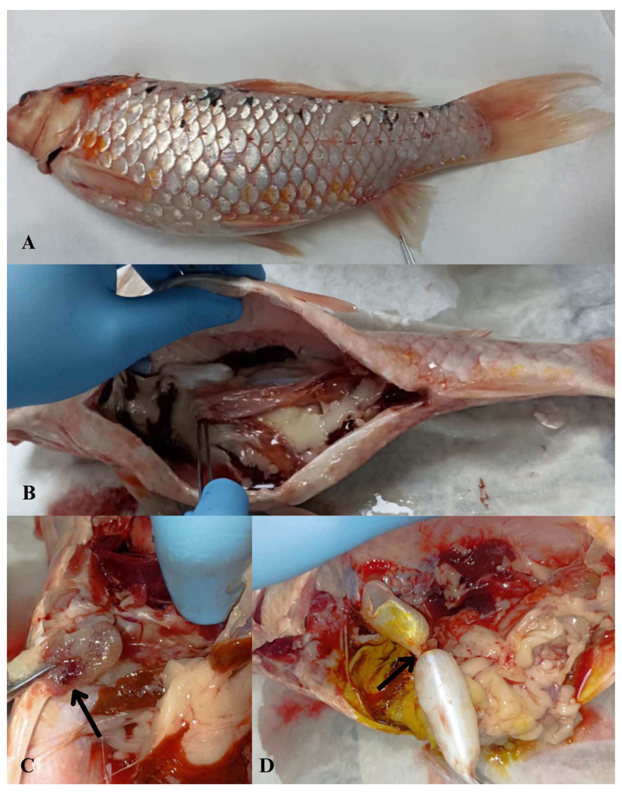 58]. In the present investigation conducted at a large aquarium wholesaler supplying fish to multiple regions of Turkey, mortality among large koi carp prompted diagnostic evaluation. Affected fish consistently exhibited abdominal distention (commonly referred to by aquarists as “dropsy”), scale loss, lateral (side) swimming, and reduced activity. Necropsy revealed severe abdominal effusion, subcutaneous hemorrhage beneath the scales, and air bladder deformation and displacement. Microbiological analyses identified two dominantly growing bacterial agents,