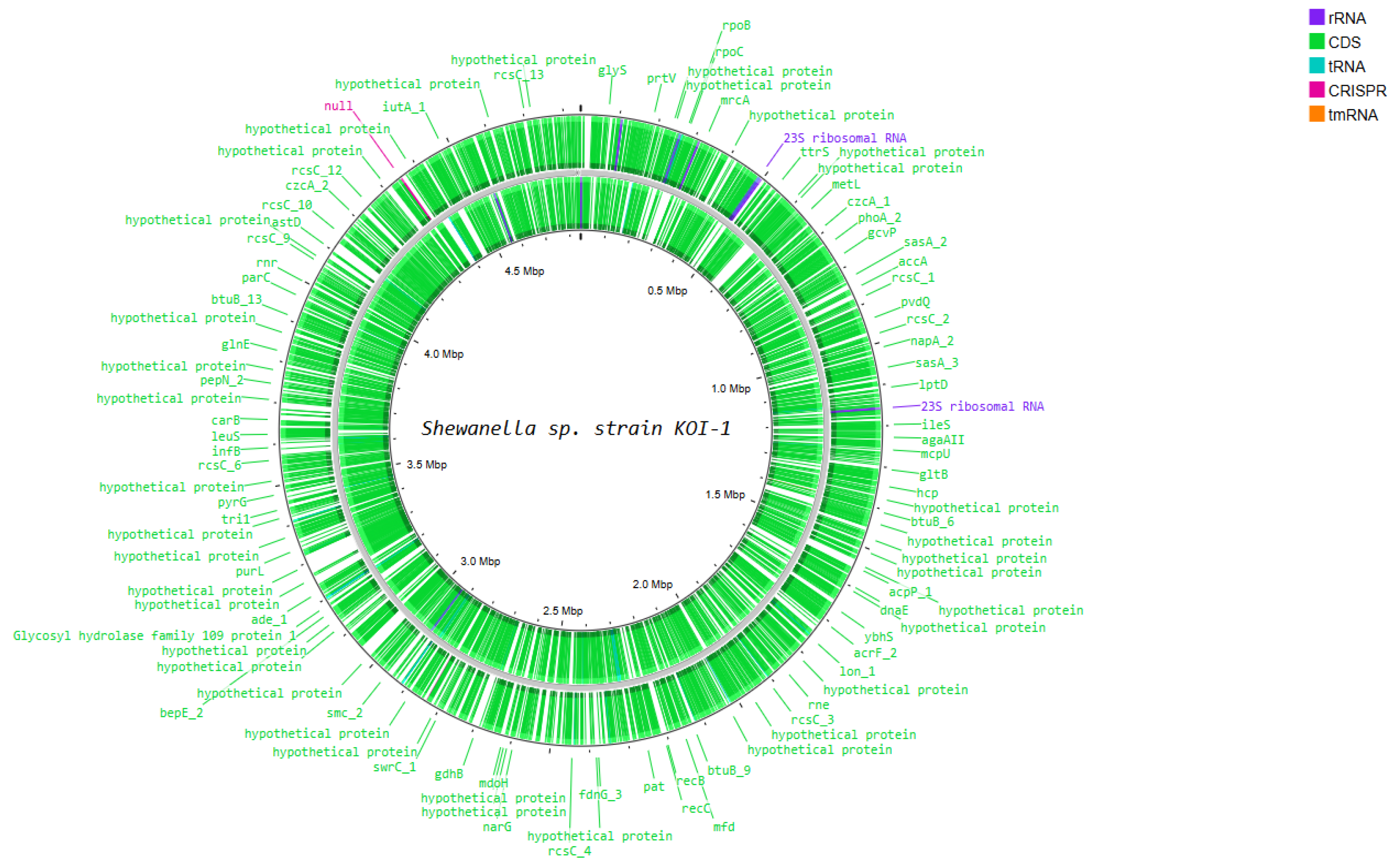 The Shewanella sp. Koi-1 and A. veronii Koi-2 strains have been deposited in the NCBI GenBank database. The Koi-1 isolate consists of three contigs, with a genome size of 4.85 Mb and a GC content of 47.96%. In contrast, the Koi-2 isolate comprises two contigs, exhibiting a slightly larger genome size of 4.89 Mb and a more compact, GC-rich genomic profile with a GC content of 58.33%. Genome annotation revealed a total of 4255 and 4614 predicted genes in Koi-1 and Koi-2, respectively, of which 4119 (Shewanella sp. Koi-1) and 4455 (A. veronii Koi-2) were identified as protein-coding sequences (CDSs). Both isolates contained a high number of rRNA (10–11 copies), tRNA (103–123), and ncRNA regions, indicating substantial translational capacity. Furthermore, 245 pseudogenes were identified in the A. veronii Koi-2 genome, compared to 84 in the Shewanella sp. Koi-1 genome, indicating that these two species have undergone distinct evolutionary adaptations.