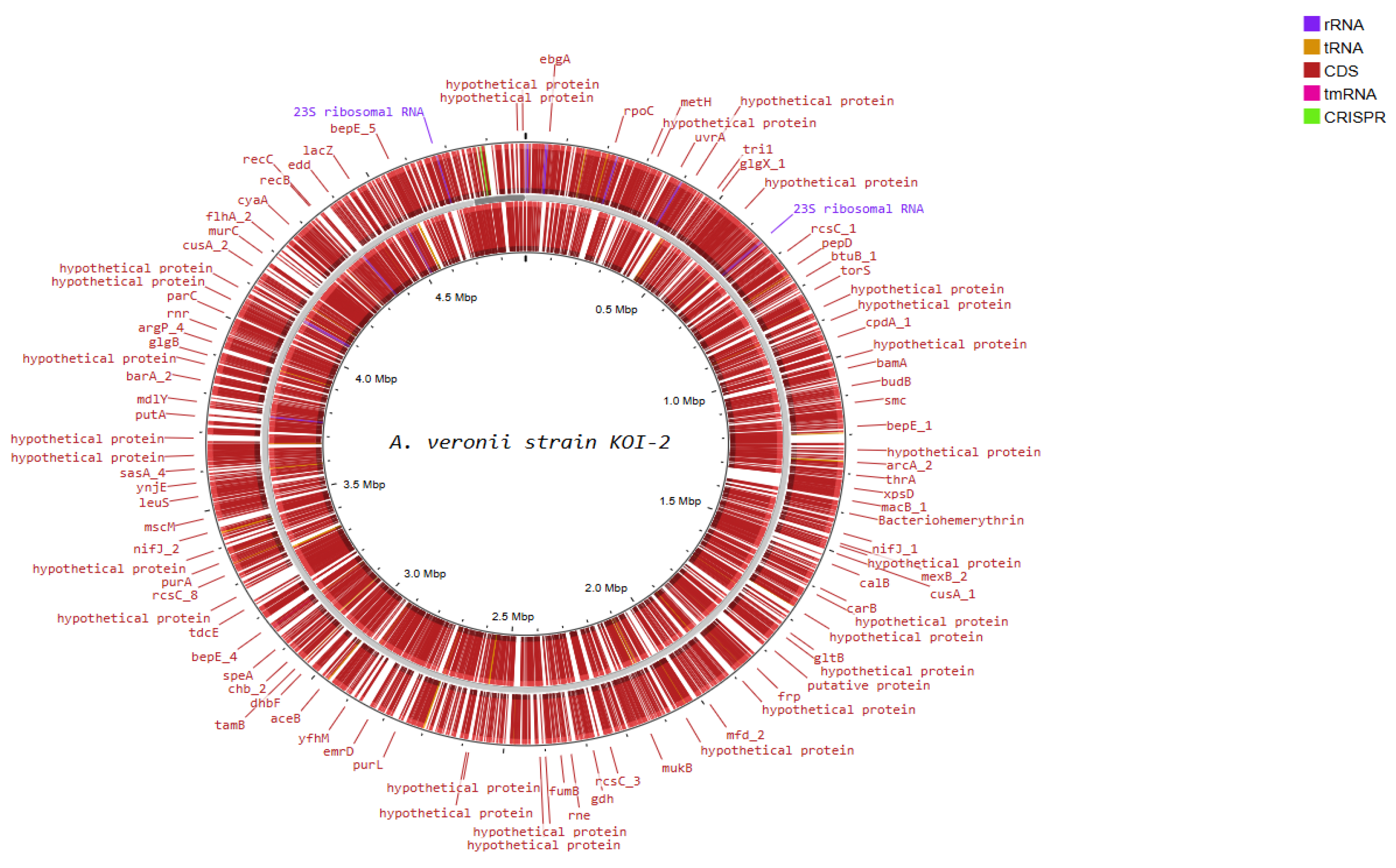 A. veronii CECT 4257 were calculated as follows: ANIb = 96.13%, ANIm = 96.45%. The digital DNA–DNA hybridization (dDDH) value was determined to be 70.2%, which is very close to the 70% threshold commonly accepted for species delineation. These findings indicate that the Koi-2 isolate shares a high degree of genetic similarity with