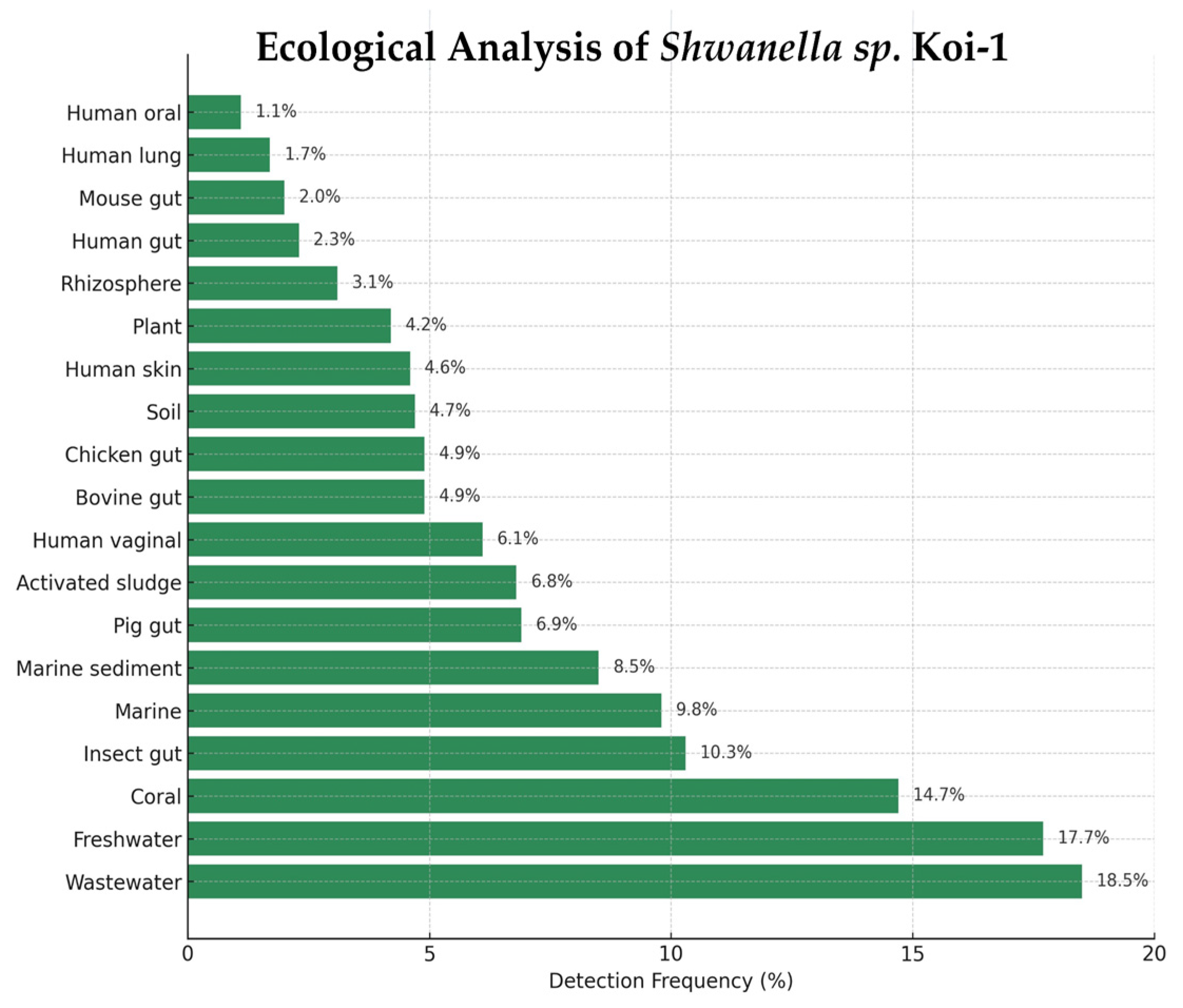Shewanella sp. Koi-1 was detected across 19 ecological categories in the Protologger output, with the highest frequencies in wastewater (18.5%) and freshwater (17.7%), followed by coral (14.7%), insect gut (10.3%), marine water (9.8%), and marine sediment (8.5%). Additional detections were recorded in pig gut (6.9%), activated sludge (6.8%), human vaginal (6.1%), bovine gut (4.9%), chicken gut (4.9%), soil (4.7%), human skin (4.6%), plant (4.2%), rhizosphere (3.1%), human gut (2.3%), mouse gut (2.0%), human lung (1.7%), and human oral (1.1%) (