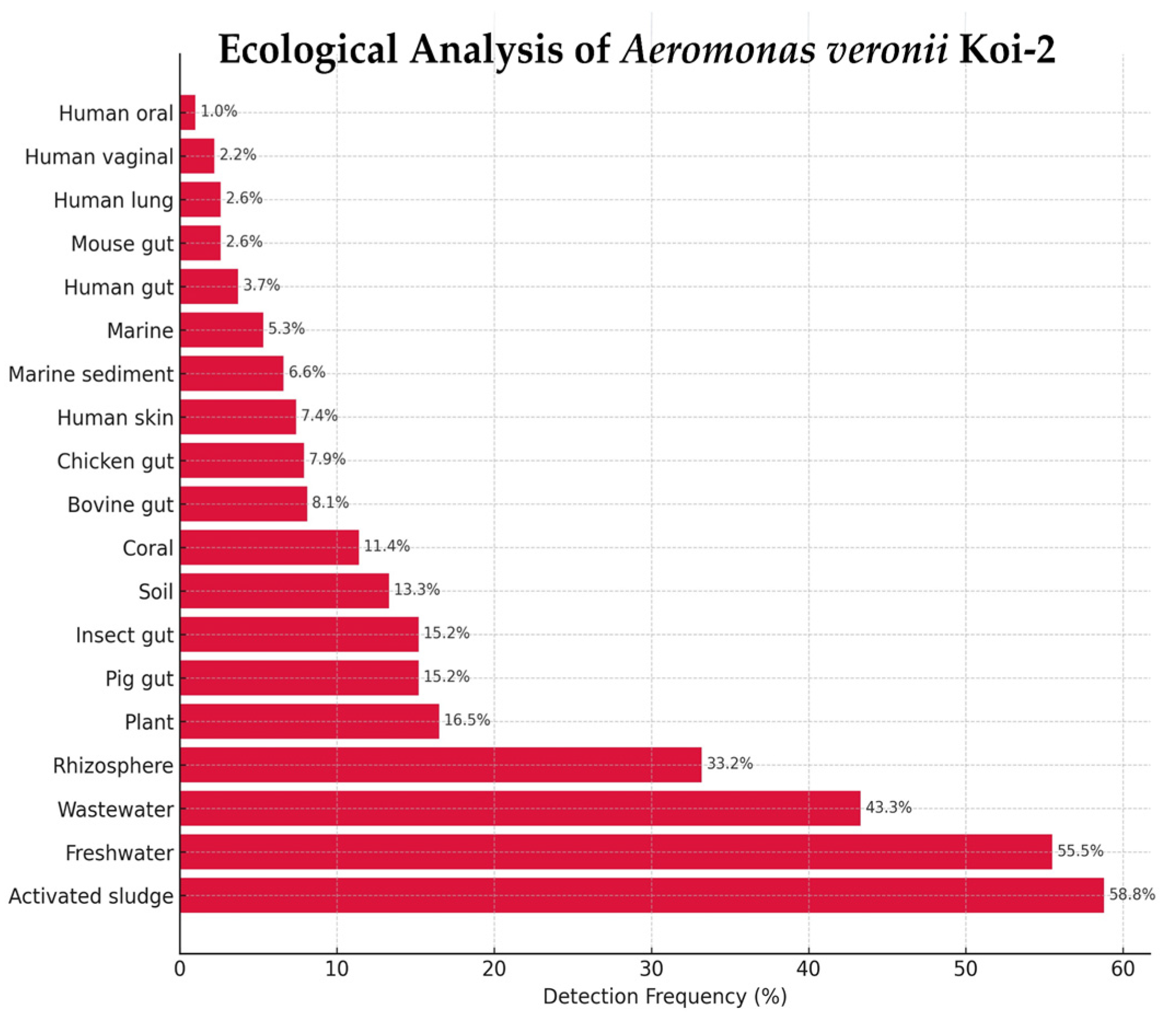 A. veronii Koi-2 was detected across 19 ecological categories in the Protologger output, with the highest frequencies observed in activated sludge (58.8%) and wastewater (43.3%), followed by freshwater (55.5%), rhizosphere (33.2%), plant (16.5%), and insect gut (15.2%) metagenomes. Additional detections were recorded in pig gut (15.2%), soil (13.3%), coral (11.4%), bovine gut (8.1%), chicken gut (7.9%), human skin (7.4%), marine sediment (6.6%), marine water (5.3%), human vaginal (2.2%), mouse gut (2.6%), human lung (2.6%), human gut (3.7%), and human oral (1.0%) metagenomes (