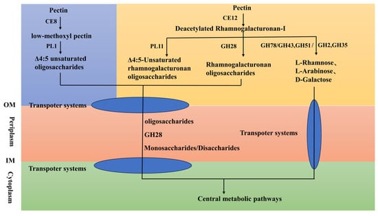 Pectin degradation pathways in Paenarthrobacter sp. FR1. Abbreviations: IM, inner membrane; OM, outer membrane; CE8, pectin methylesterase, CE12, rhamnogalacturonan acetylesterase, PL1, pectin lyase, PL11, rhamnogalacturonan lyase, GH28, endorhamnogalacturonase, GH78, α-L-rhamnosidase, GH43, α-L-arabinofuranosidase, GH2, β-galactosidase, GH51, α-L-arabinofuranosidase, GH35, β-galactosidase.