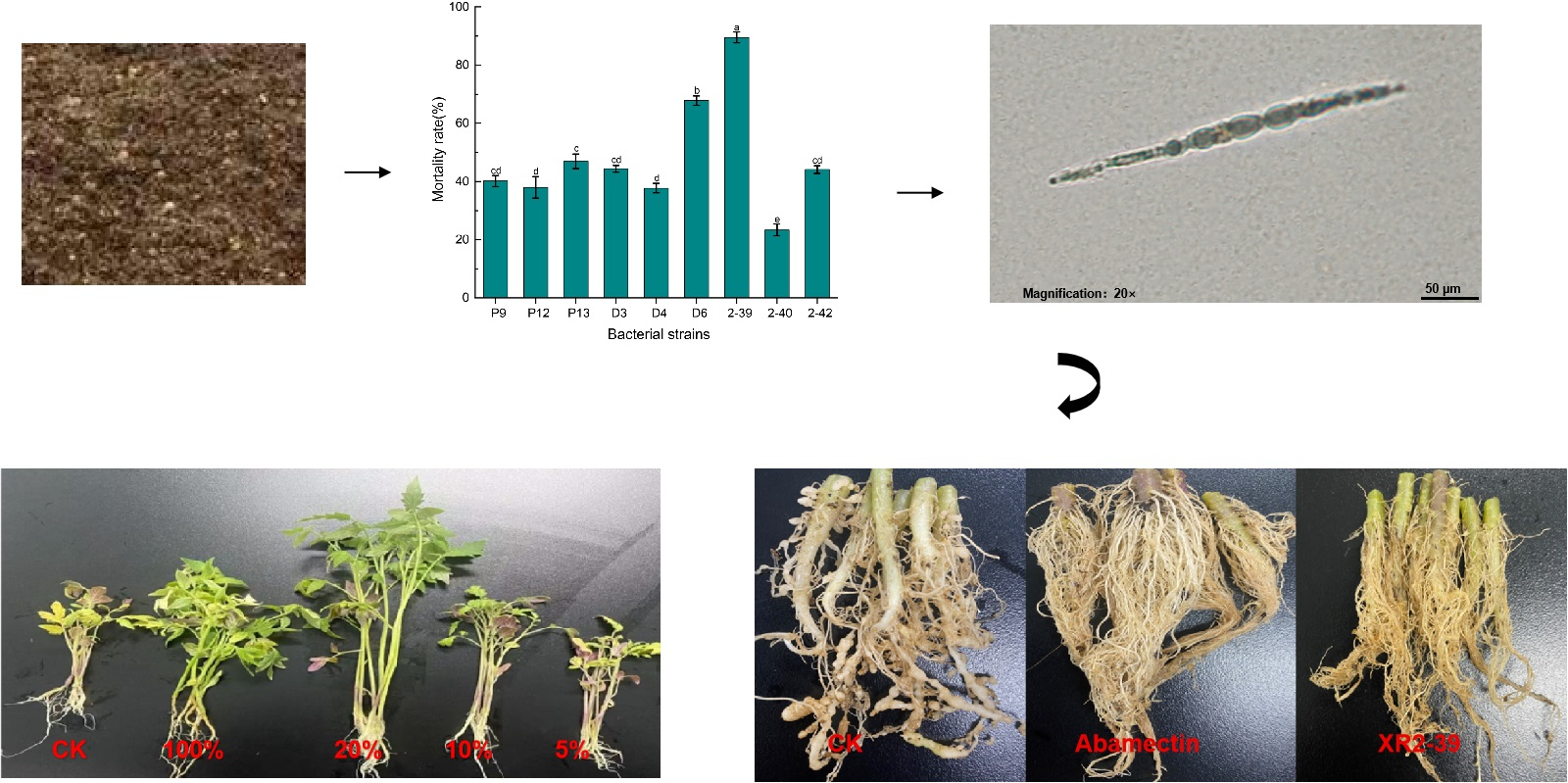Figure 1. The mortality rate of the bacterial strains on J2s of M. incognita. Different lowercase letters indicate significant differences among strains (p < 0.05).