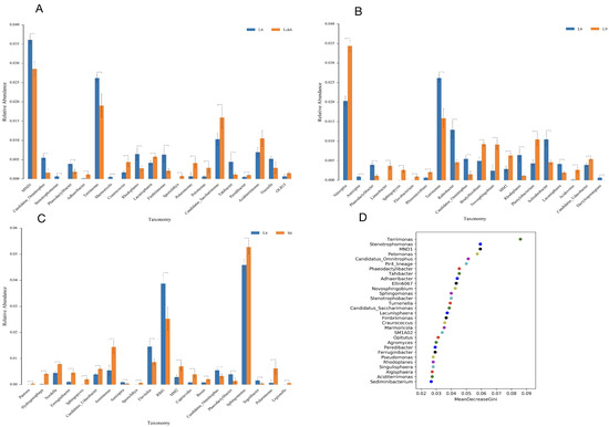 Figure 3A–D). Comparative analysis between exudate-amended and sterile-water-treated soils revealed that root exudates consistently enriched members of the Proteobacteria phylum (