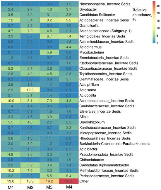These bacteria include acidophilic and acidotolerant heterotrophic bacteria capable of growing at low temperatures, such as Acidisoma bacteria isolated from acidic tundra soil [72]. Bacteria of the genus Bryobacter, identified in all M1–M4 samples, are chemoorganotrophs, which were previously isolated from acidic sphagnum peat bogs [67].