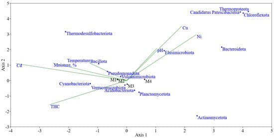 Canonical correspondence analysis (CCA) of 16S rRNA gene-based microbial community composition in highly contaminated M1–M3 soil samples and in a clean control M4 soil as well as environmental parameters, including the total petroleum hydrocarbons (TPH) and Cu, Ni, and Cd contamination, soil moisture, pH and temperature. Green lines indicate the direction of microbial composition associated with environmental parameters.
