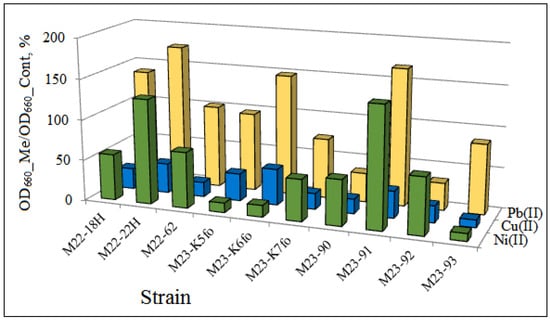 Laboratory analysis revealed the content of heavy metals (nickel, copper, and cadmium) in M1–M3 soil samples exceeded the approximate permissible concentration. The toxicity of heavy metals occurs in low concentrations of about 1.0–10 mg·L−1 while some metals ions such as Chromium (Cr), Lead (Pb), Zinc (Zn), Copper (Cu), Nickel (Ni), Cadmium (Cd), etc., are very toxic in lower concentration of 0.001–0.1 mg·L−1 [91]. The maximum tolerance concentration to heavy metals for the isolated bacterial strains was not determined in this study. The presence of 40 μg·Ni2+ L−1 in a medium stimulated the growth of two strains, P. yamanorum M22-22H and R. ginsengisoli M23-91 (Figure 5). The Cu2+ concentration used (75 μg·L−1) suppressed the growth of all 10 strains studied. Five strains, M22-18H, M22-22H, M23-K6fo, and M23-91, were insensitive to Pb2+ at a concentration of 100 μg·L−1. The resistance of the isolates to heavy metals decreased in the range Pb(II) > Ni(II) > Cu(II), which is comparable with data of other researchers [91]. However, the maximum tolerance concentration to heavy metals of bacteria of the genera Pseudomonas, Cupriavidus, Bacillus, and Acinetobacter [91,92] was essentially higher of metal concentrations used in our study. The studied microorganisms are adapted to inhabit soils slightly polluted with heavy metals. These results indicate the adaptation of the isolated strains to the conditions of their habitat and their possible participation in the process of soil self-purification.