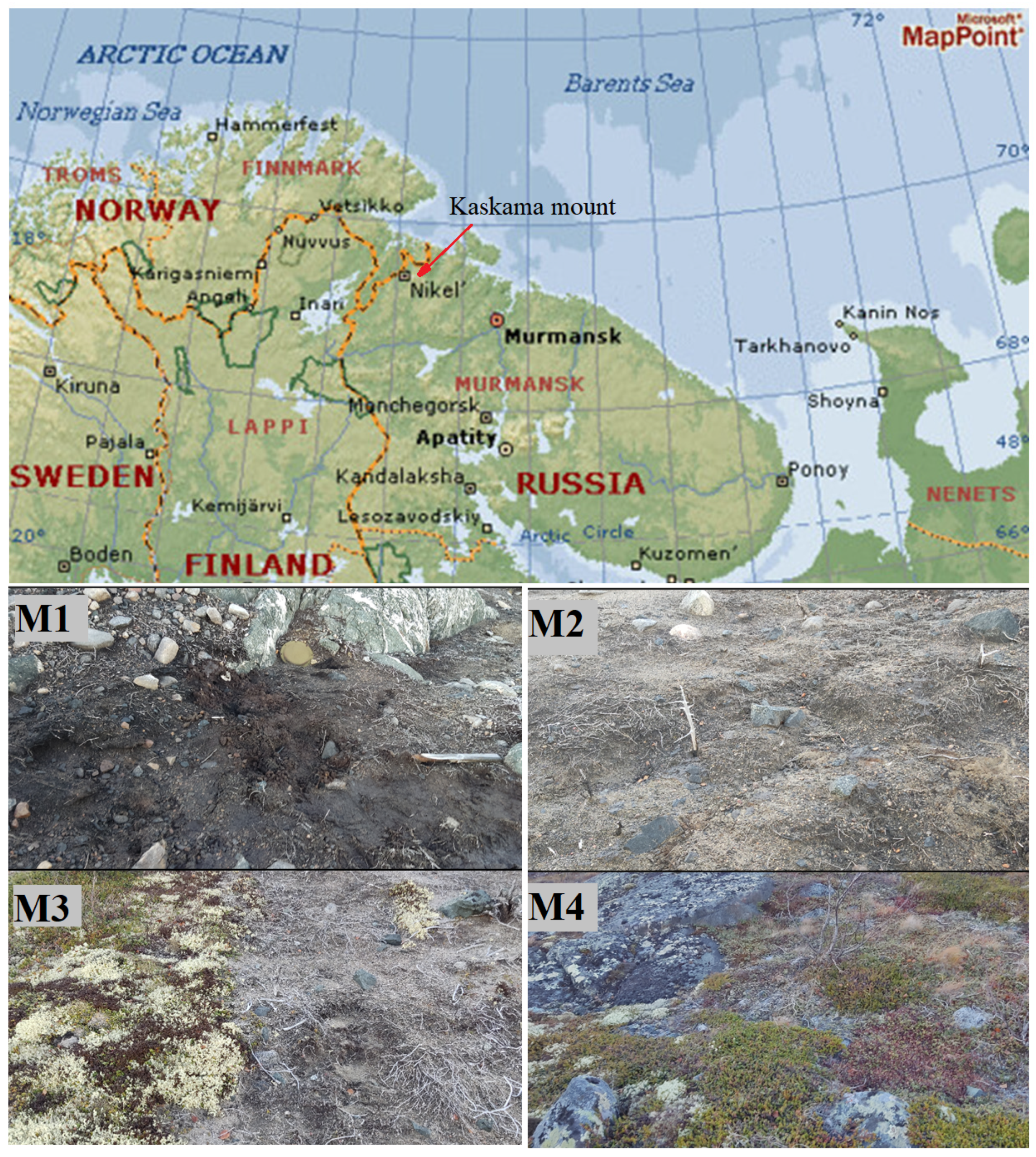 - Korneykova, M.V.; Myazin, V.A.; Fokina, N.V.; Chaporgina, A.A.; Nikitin, D.A.; Dolgikh, A.V. Structure of microbial communities and biological activity in tundra soils of the Euro-Arctic region (Rybachy peninsula, Russia). Microorganisms 2023, 11, 1352. [Google Scholar] [CrossRef]