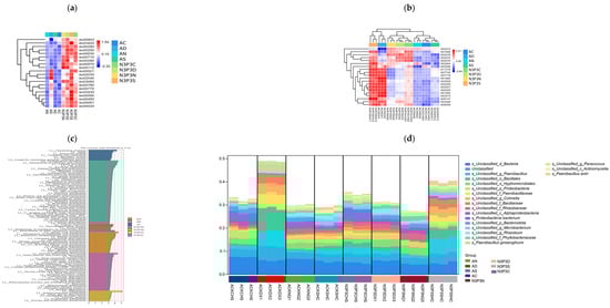 Figure 2a shows the relative abundances of the top 20 species of microorganisms in the substrate during the growth process of V. volvacea. The results revealed that in the no-nutrient addition group, the abundance of anylobacter Polymorphus, Conexibacter arvalis, pseudolysimonas yzui, Roseomonas, hellenica and Phragmitibacter flavus increased. These beneficial bacteria can interact with the host, provide nutrients to the host, and promote the production of V. volvacea [33]. In the nutrient addition group, Bacillus gastroenteritis, Trichosporum spheroidium, Pachyphylum, Lead acidophilus, and Devosia elaeis were more abundant. These microorganisms usually serve as functional extensions of the host genome and exert a vital role in the regulation of host physiology and metabolism [34].