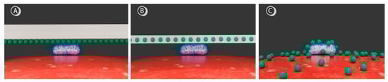 In principle, three approaches can be chosen when decontaminating (packaged) food. The PS can either be adhered to the packaging materials (Figure 1A) or covalently bound to the packaging matrices (Figure 1B). As an alternative, the photoactive compound may be directly applied to food products, e.g., by spraying (Figure 1C).