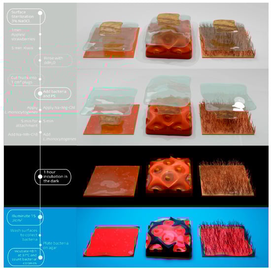 Schematic overview of the Photodynamic Decontamination experimental method. The timeline on the left shows the key steps in the process, from surface sterilization through bacterial counting. The right side illustrates the different deposition approaches and treatment phases: (top) PS (Na-Mg-Chl) applied before L. monocytogenes, (second) L. monocytogenes applied before Na-Mg-Chl, (third) incubation in the dark for 1 h, and (bottom) irradiation phase with 395 nm LED array (15 J cm−2). Fruit plugs (1 cm2) with different surface types are shown throughout: apple (smooth), strawberry (uneven), and kiwi (fuzzy).