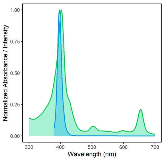 Spectral overlap between homemade LED array emission (blue curve) and Na-Mg-Chl absorbance (green curve). The absorbance signal of Na-Mg-Chl was measured using an Infinite M200 (Tecan Austria GmbH, Grödig, Austria) microplate reader. The homemade LED light source consisted of 480 LEDs, with a dominant wavelength of 395 nm (Kingbright Electronic Europe GmbH, Issum, Germany). For the experiment, samples were illuminated from above at a radiant exposure of 15 J cm−2. The emission of the LED source at 395 nm substantially overlaps with the Na-Mg-Chl absorbance peak at 402 nm, enabling efficient excitation.
