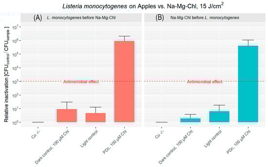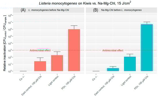 Relative inactivation (CFUCo −/−/CFUsample) of L. monocytogenes after PDc of kiwis. In (A), L. monocytogenes was applied to the kiwis’ surface, followed by the addition of Na-Mg-Chl after 5 min. (B) illustrates Na-Mg-Chl (Chl on the graph) being applied first, with L. monocytogenes added to the surface 5 min later. PDc was carried out using an LED array (395 nm, 17 mW cm−2, 15 J cm−2). Two controls were kept in the dark: Co −/− (DPBS only) and another with the PS and bacteria. The light control contained DPBS and was illuminated. PDc was a positive control with 100 µM Na-Mg-Chl and was illuminated. The red dash indicates a 3 log reduction. The bars represent the average of six independent biological replicates, including their corresponding error bars.