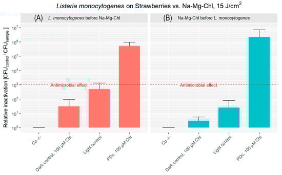 Relative inactivation (CFUCo −/−/CFUsample) of L. monocytogenes after PDc of strawberries. In (A), L. monocytogenes was applied to the strawberry surface first, followed by the addition of Na-Mg-Chl (Chl on the graph) after 5 min. (B) shows Na-Mg-Chl inoculated first, with L. monocytogenes added onto the surface after 5 min. PDc was performed using a LED array (395 nm, 17 mW cm−2, 15 J cm−2). Controls: Co −/− (no light, no PS), Dark control (no light, PS). The light control contained DPBS and was illuminated. PDc was a positive control with 100 µM Na-Mg-Chl and was illuminated. The red dash corresponds to a 3 log reduction. The bars represent the average of six independent biological replicates, including their corresponding error bars.
