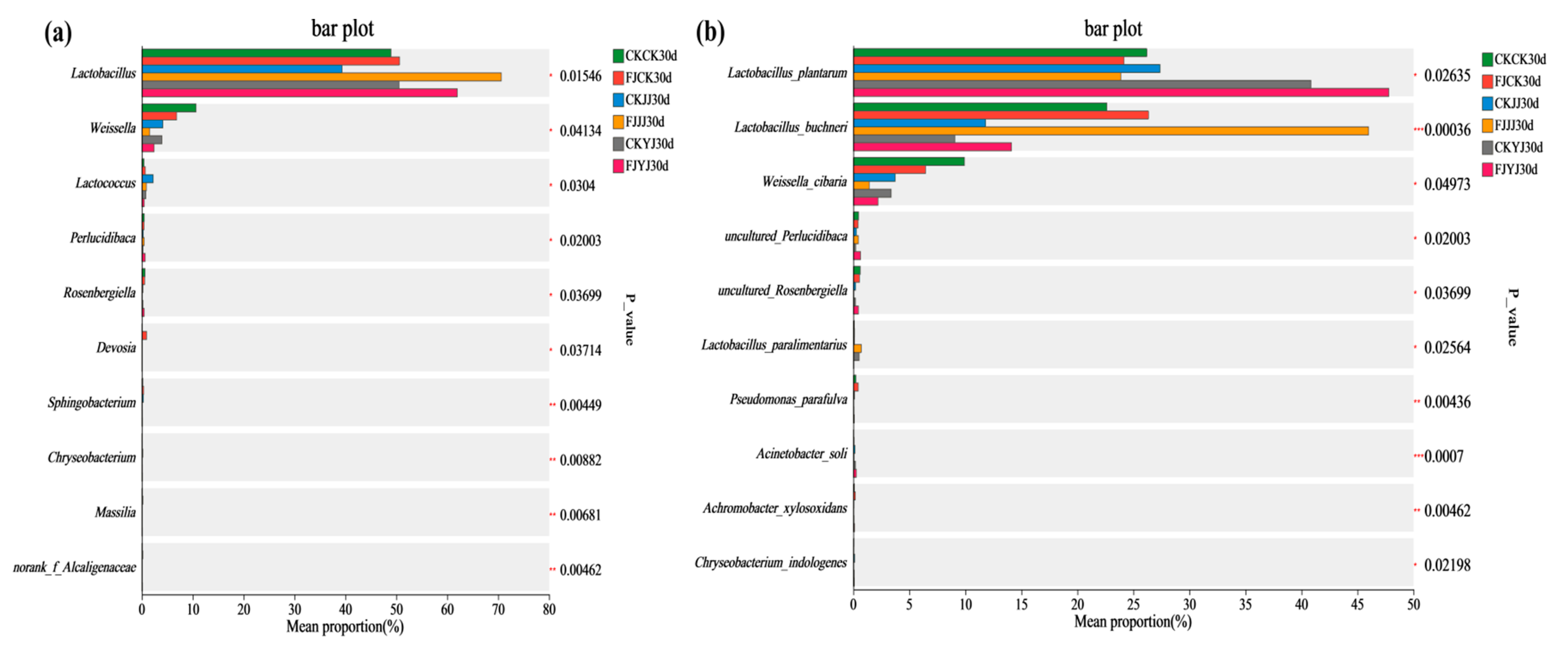 3.3. Analysis of Microbial Diversity in Whole-Plant Corn Silage Treated with Silage Inoculant Under Different Fertilization Regimes