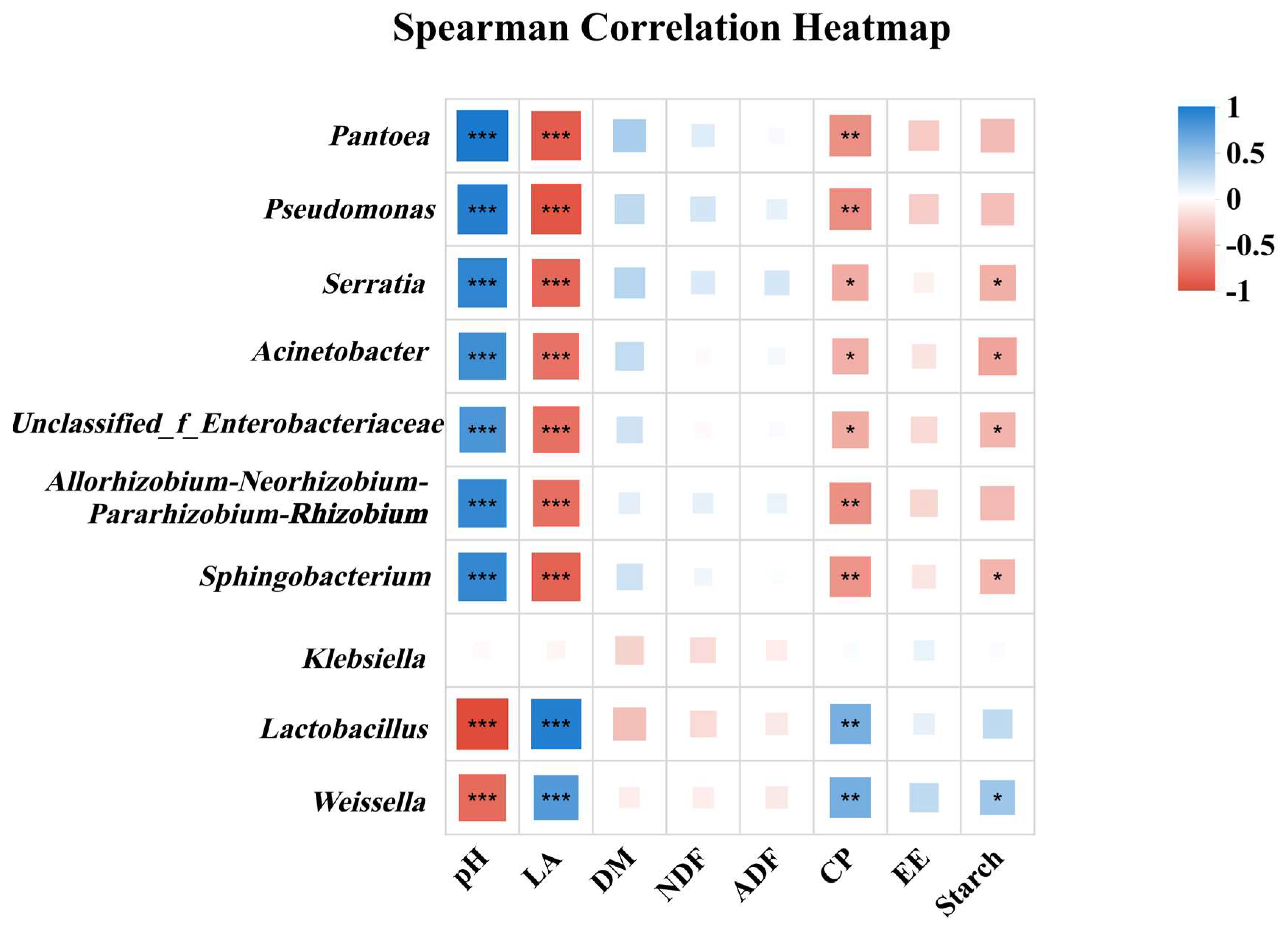 3.4. Correlation Between Dominant Bacterial Communities and Key Nutritional Indicators in Whole-Plant Corn Silage Treated with Silage Inoculant Under Different Fertilization Regimes